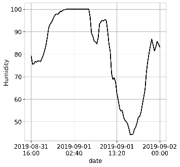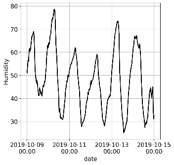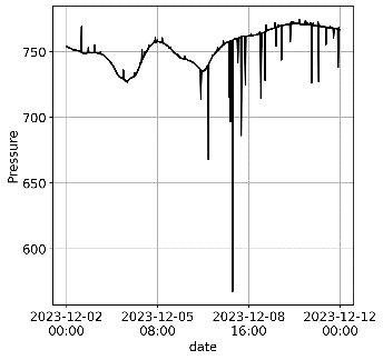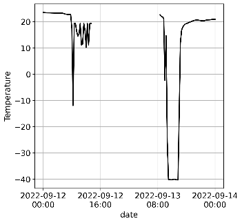 3. Плато — это подпоследовательность ряда, в которой значения не меняются (или почти не меняются), т. е. дисперсия близка к нулю. Этот тип сбоя обнаружить проще всего. Яркой иллюстрацией плато является сбой измерения относительной влажности при накоплении конденсата в оборудовании (рис. 1). Отметим, что на рис. 1 (е) давление между 12:00 5 февраля и началом 10 февраля 2022 года измерялось в нормальном режиме, и небольшой разброс измерений не является признаком плато.
