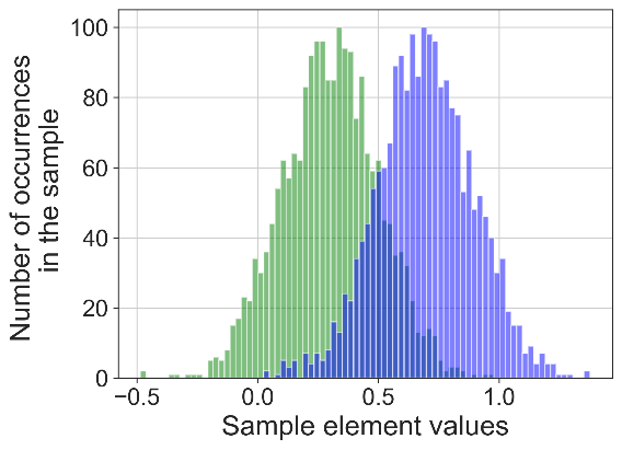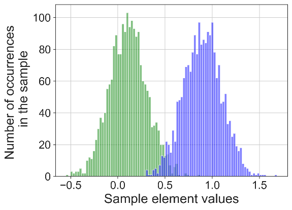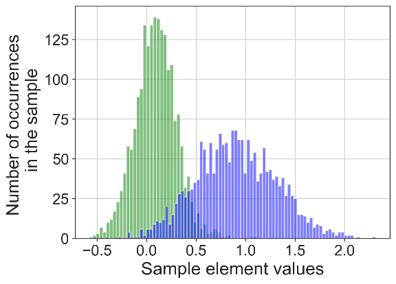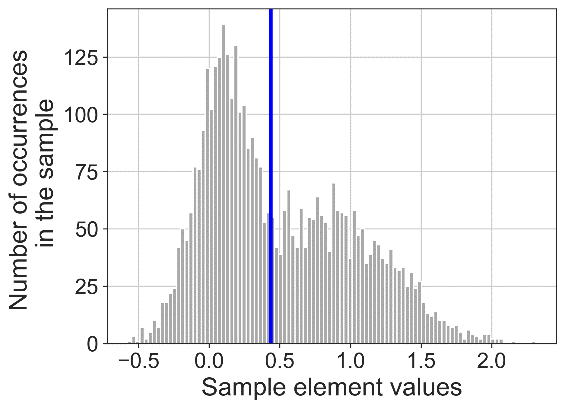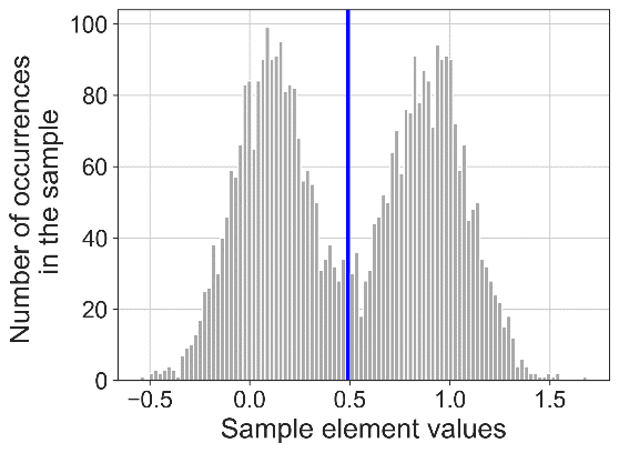В рамках этапа работы были проведены исследования по эффективности предложенного алгоритма на синтетических и реальных данных. Например, на рисунках 1-3 приведено сравнение действия по разделению на классы синтетически сгенерированных бимодальных рядов (с известной классификацией) с помощью порогового метода и предложенного алгоритма.